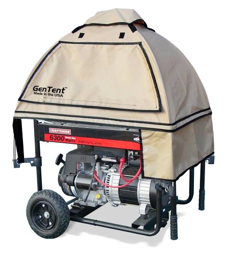 Do you use your portable generator in wet weather? Of course! Do you feel safe doing so? Many people run portable generators in the garage because manufacturers warn to never use the generator in wet weather. Read your user guide, or the warning labels on your generator!Why can't portable generators be used in wet weather? Because water can get into the electrical outlets. You risk electrocution if the electrical panel gets wet. Finally, you can run your portable generator in wet weather with the GenTent, the best way to keep your portable generator safe to use in wet weather.Tan with black trim, the GenTent provides a pleasing finished look to your portable generator, while keeping it safe to use in wet weather of nearly any kind. Withstands winds up to 60mph and snow up to 18". The GenTent ships complete with electrical outlet protection skirts to cover electrical outlet side. GenTent includes a universal clamping system that allows the GenTent to fit nicely on a wide range of portable generators from roughly 3,500 watts up to 10,000 watts**. GenTent design maintains proper cooling airflow to your portable generator unlike dog house or other enclosures that can cause overheating. Adapters are included that accommodate round and square tubular frames. Marine grade, Made in the USA, 3 year materials and workmanship warranty. Clamp it, Frame it and Cover it in three easy steps to Weatherproof your Power!** Not for RIDGID RD series, Honda EU6500is or similar fully enclosed generators, or generators with non-folding, fixed handles. Clamping system must have place for mounting on the generator frame.Model : GT-A-TB-U