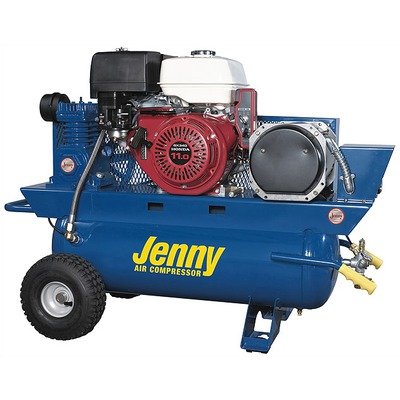 G13HGA-17P-3000W-F38M-LB38 Air Line Filter - Metal Bowl - 3/8 NPT: Yes, Lubricator - Bowl Type - 3/8 NPT: Yes This Special Portable Compressor/Generator is proudly made in Somerset, PA USA. This gas-powered unit is both an air compressor and an electrical generator. This combination is perfect for every industrial application that requires electrical power and air; it features a reliable Honda GX Series OHV Engine with constant run control set at 105 - 125 PSI. This Special Portable Compressor/Generator has a high quality special unloading valve to assist in engine starting, a pressure relief safety valve, comes equipped with pneumatic throttle idle control has powder coated ASME certified receivers and comes with a tank gauge, regulator and outlet pressure gauge. This Jenny Gas Engine Compressor/Generator has an output of 3000 Watts and comes with a limited 2-year warranty, is designed, tested and proven to meet demands of the construction and rental industry and comes filled with Jenny Synthetic Blue Compressor Pump Oil. Features: -Heavy-duty single stage cast iron compressor pump made in Somerset, PA USA -Honda Engine -Constant run control set at 105 - 125 PSI -Pneumatic throttle idle control -High quality special unloading valves to assist in engine starting -Splash lubricated -Oil Sight Glass -Belt driven with a large flywheel for extra cooling and easier start-up -Each unit is filled with Jenny Synthetic Blue Compressor Pump Oil -Directional air shroud for reduced pump temperatures -Totally enclosed heavy-duty belt guard -Powder coated ASME certified receivers -Protectively mounted fittings -Manual tank drain(s) -Large canister intake filter with replaceable filter elements -Tanks are powder coated and ASME certified -High quality special unloading valves to assist in motor starting -Stainless steel braided discharge hose -Tank gauge -Regulator and outlet pressure gauge -Pressure release safety valve -Designed, tested and proven to meet demands of the construc